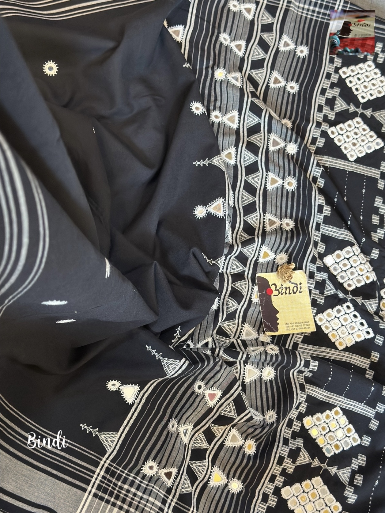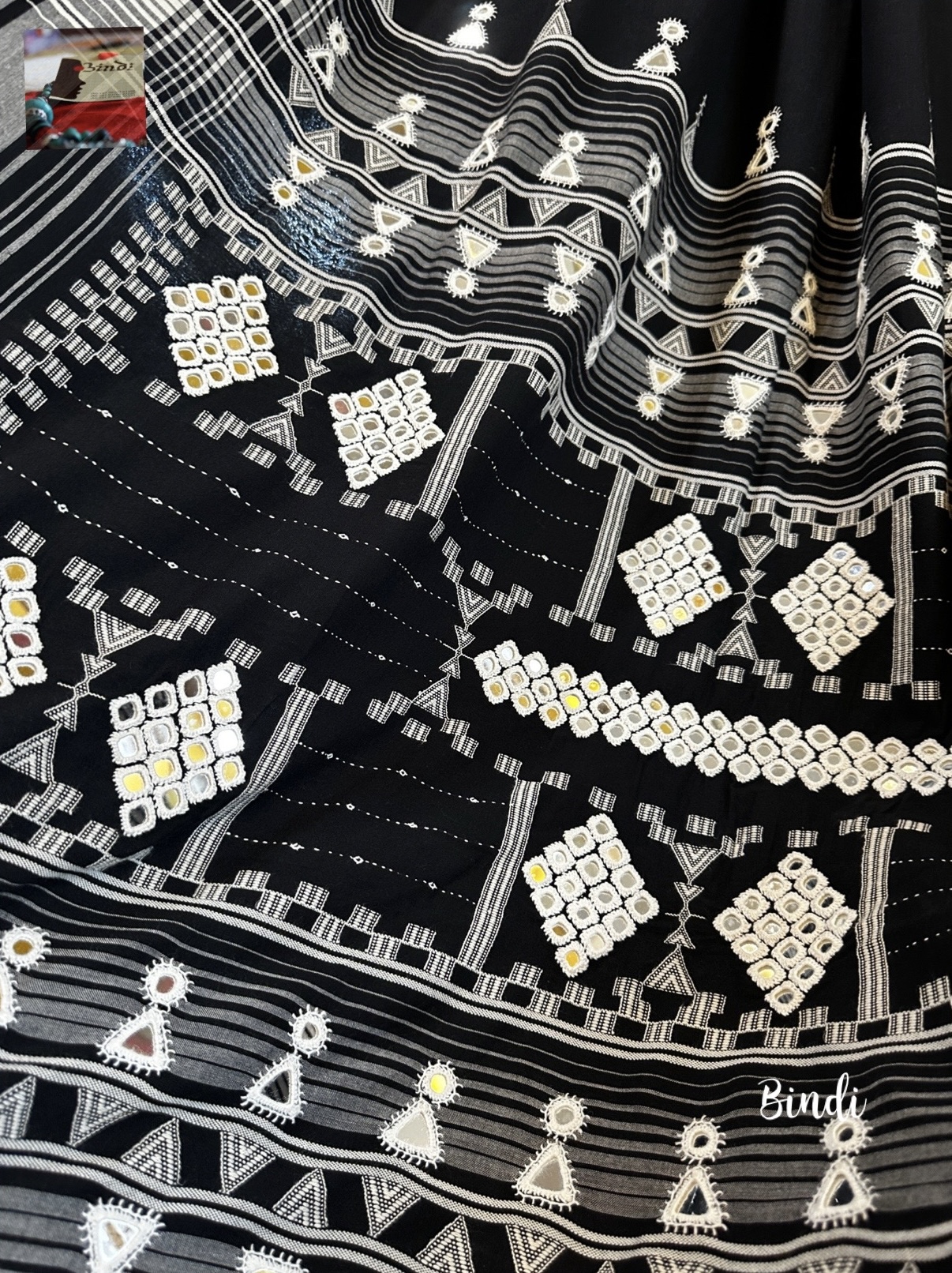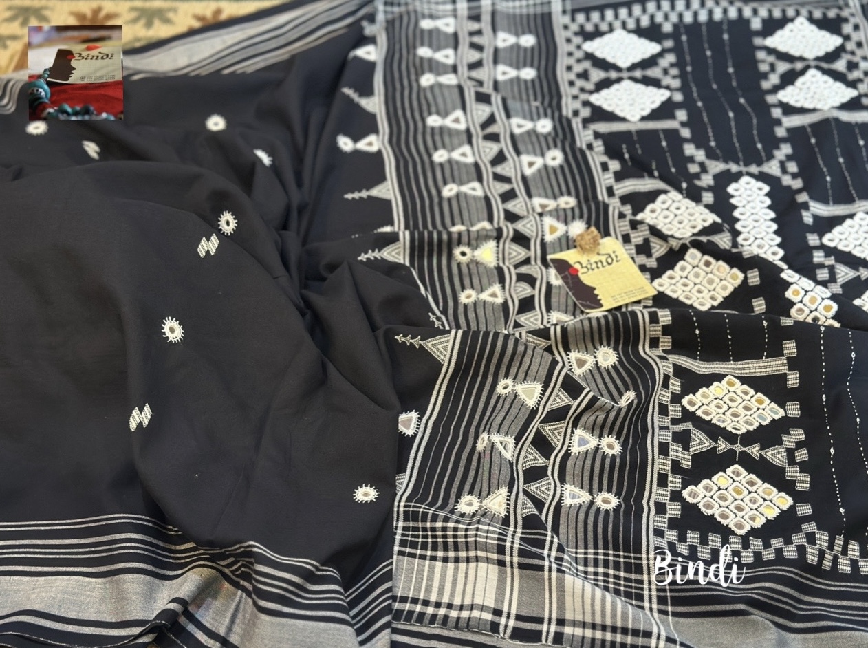 Handcrafted mirror hand embroidery on pure Kala Cotton BHUJODI saree from Bhuj, Gujarat