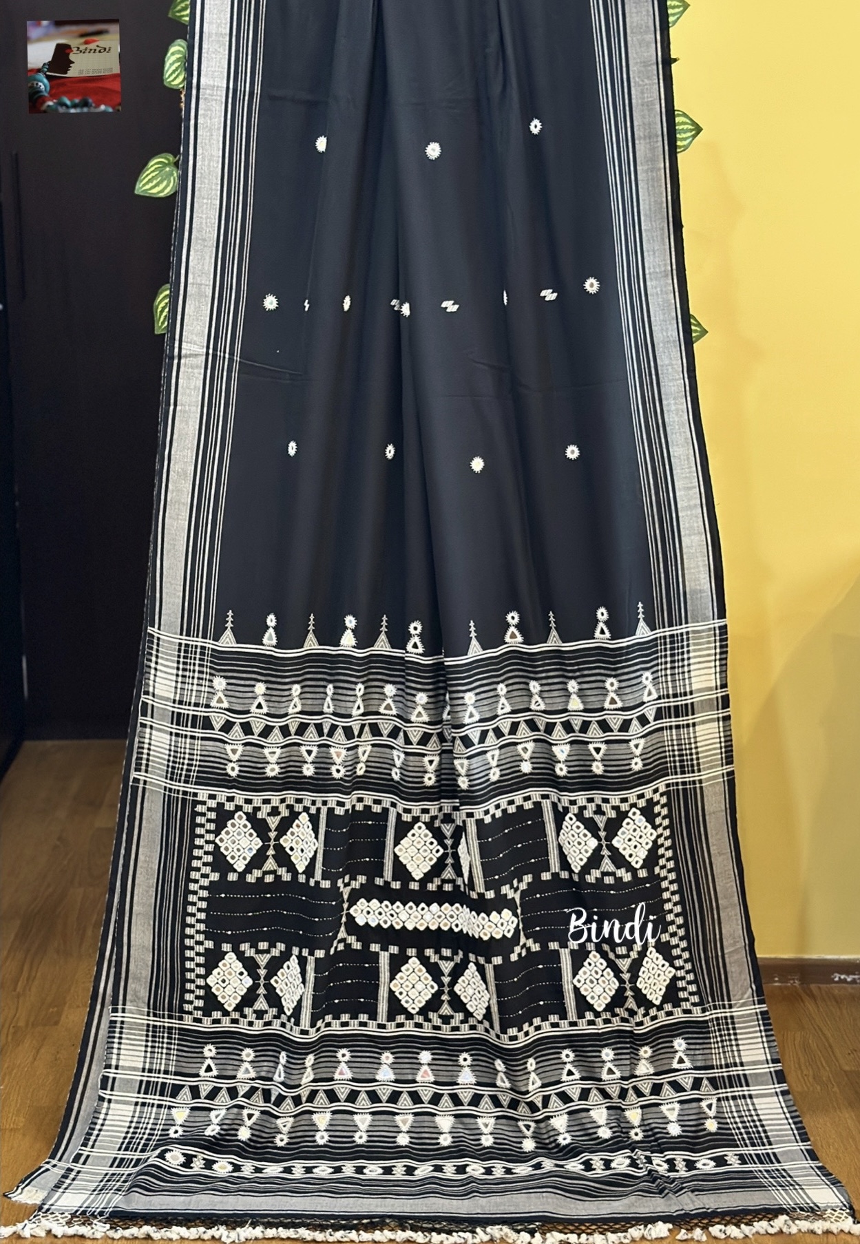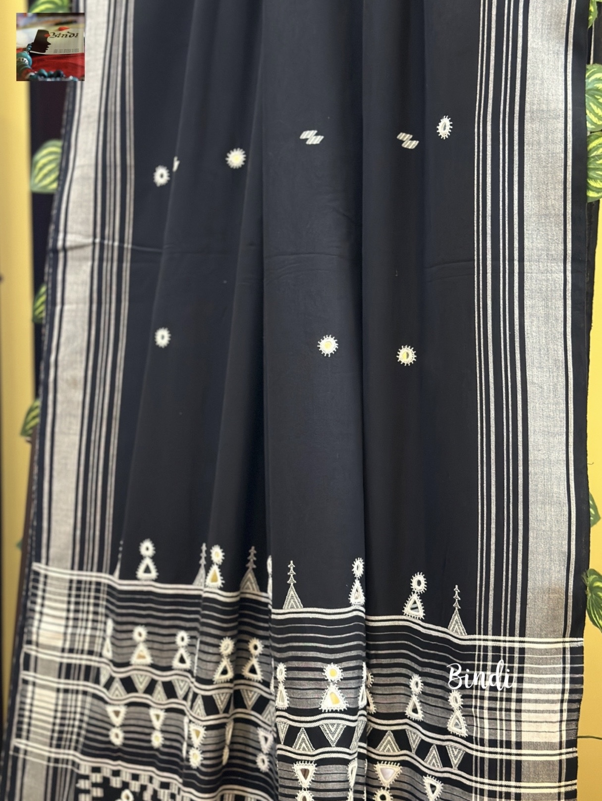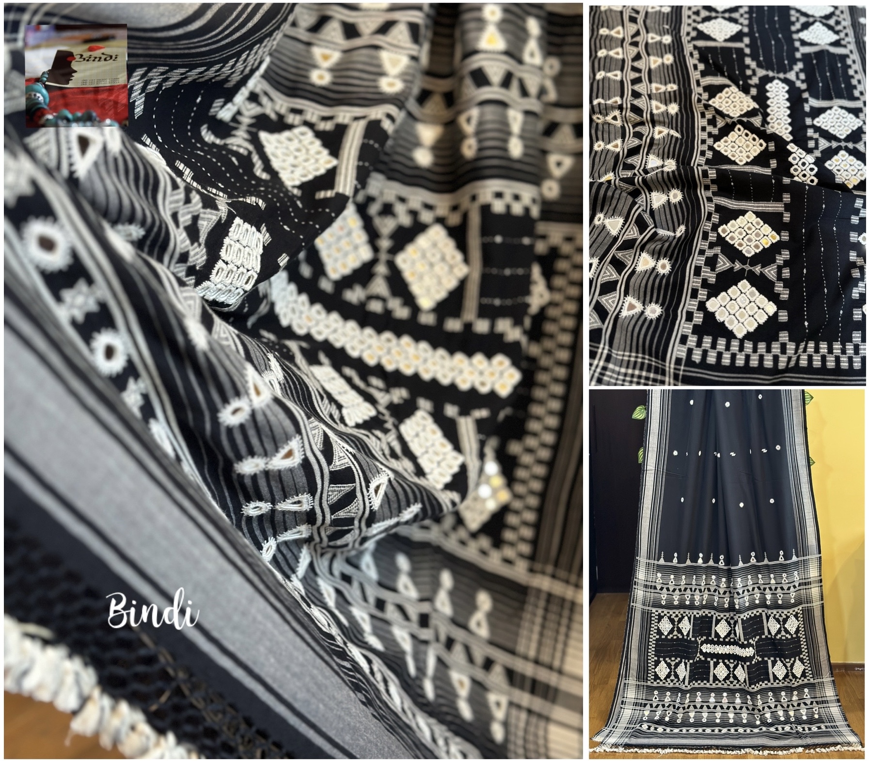 Handcrafted mirror hand embroidery on pure Kala Cotton BHUJODI saree from Bhuj, Gujarat