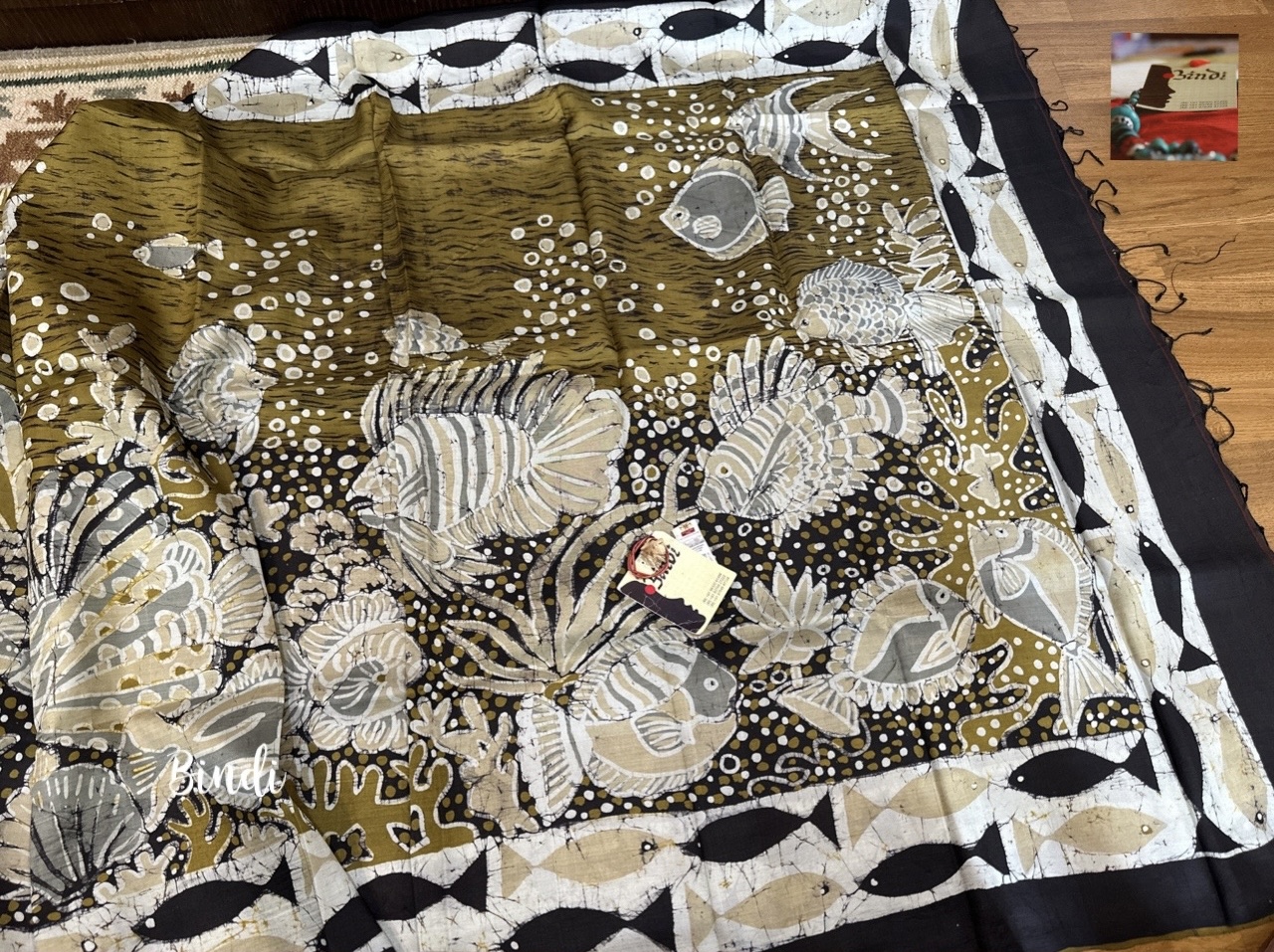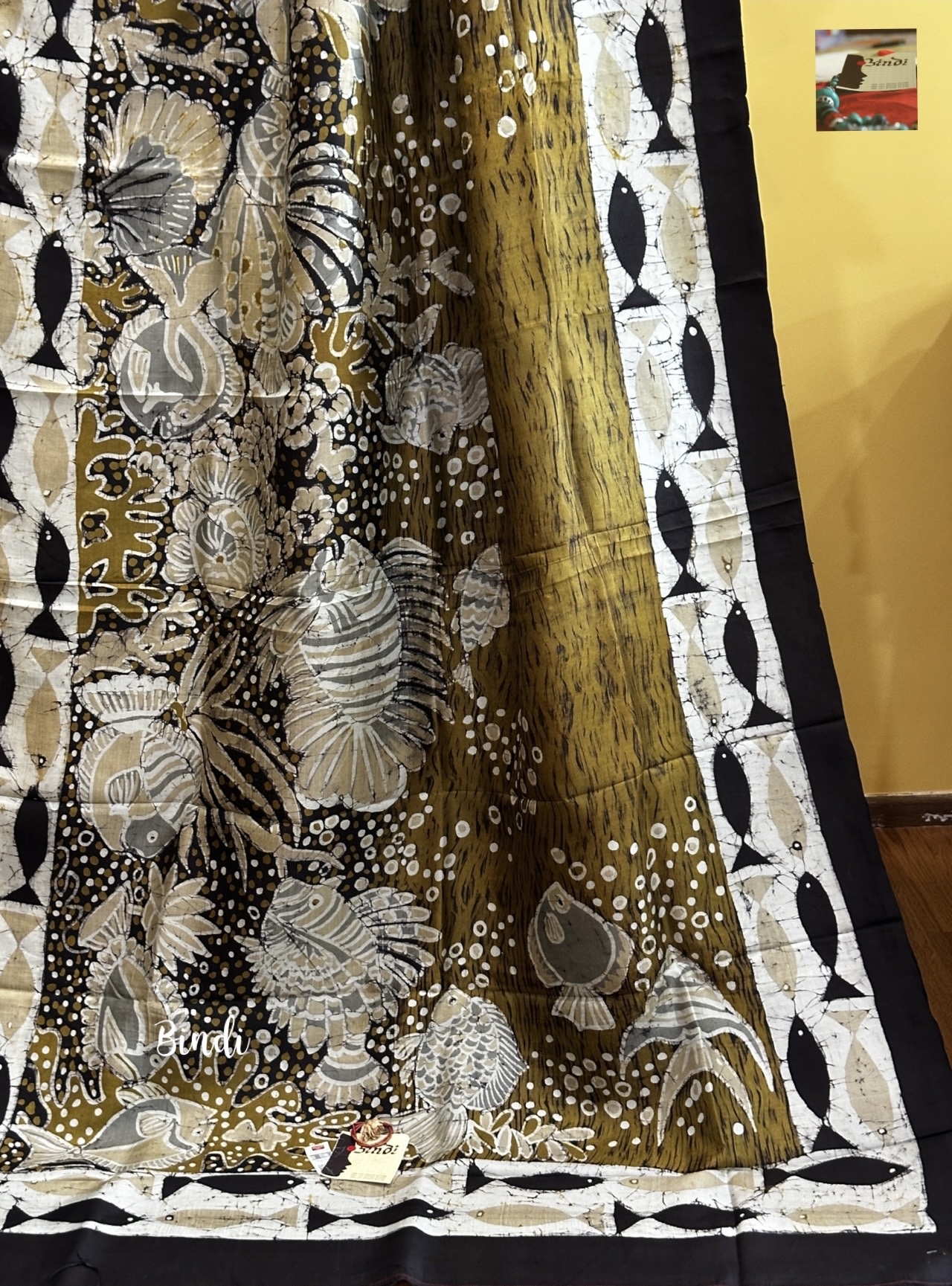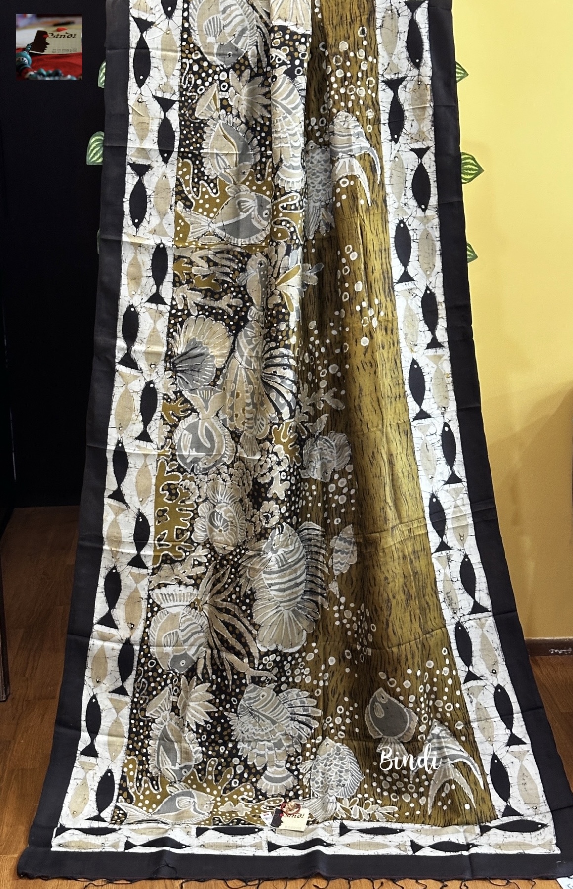Premium Katan silk saree with exquisite wax-resist batik painting. Featuring intricate fish and aquatic motifs in earthy tones of olive, mustard, ivory, framed with bold fish motif borders. A luxurious drape blending tradition with artistry.