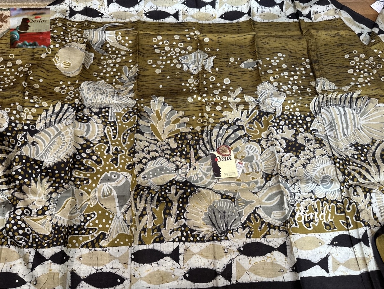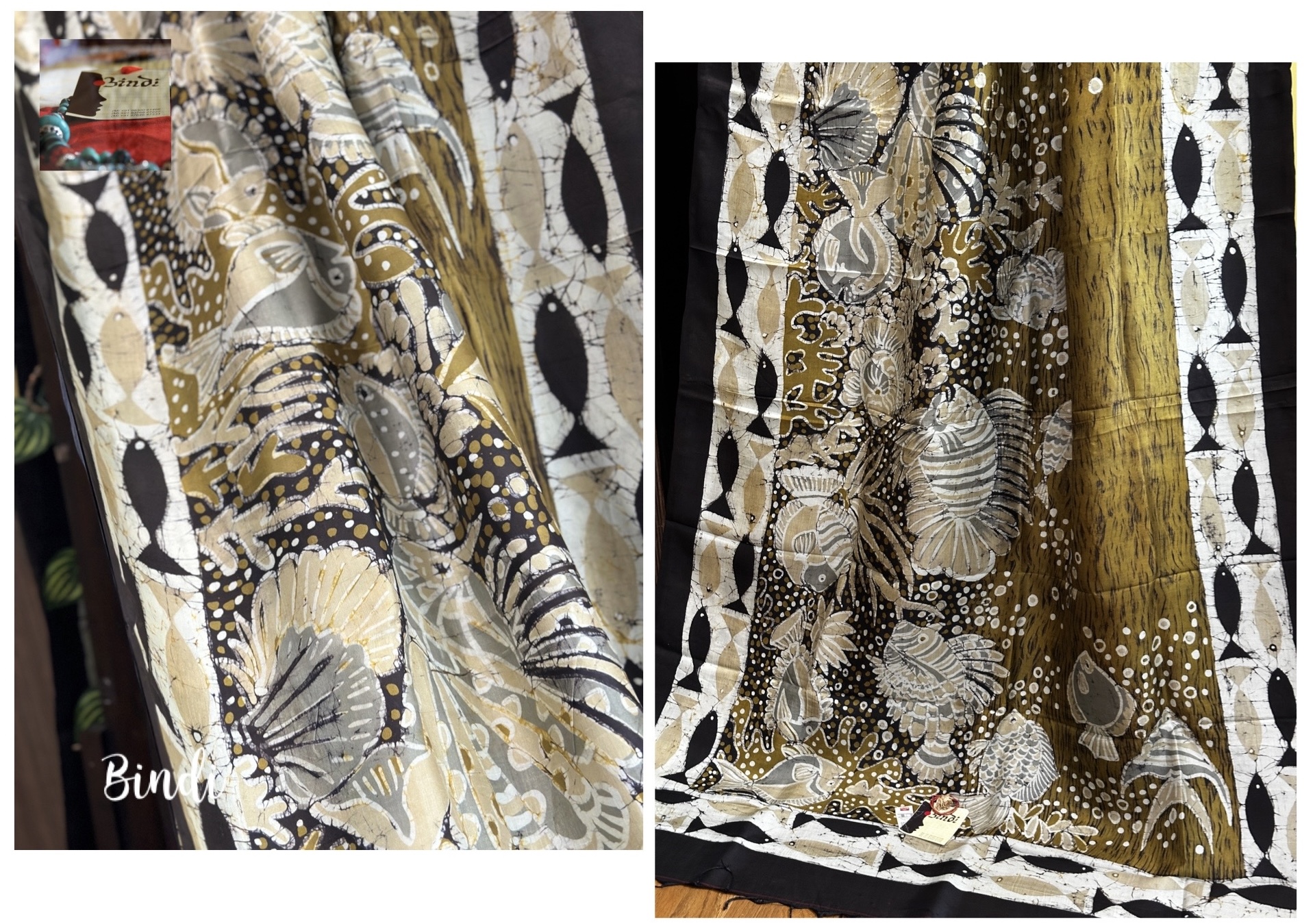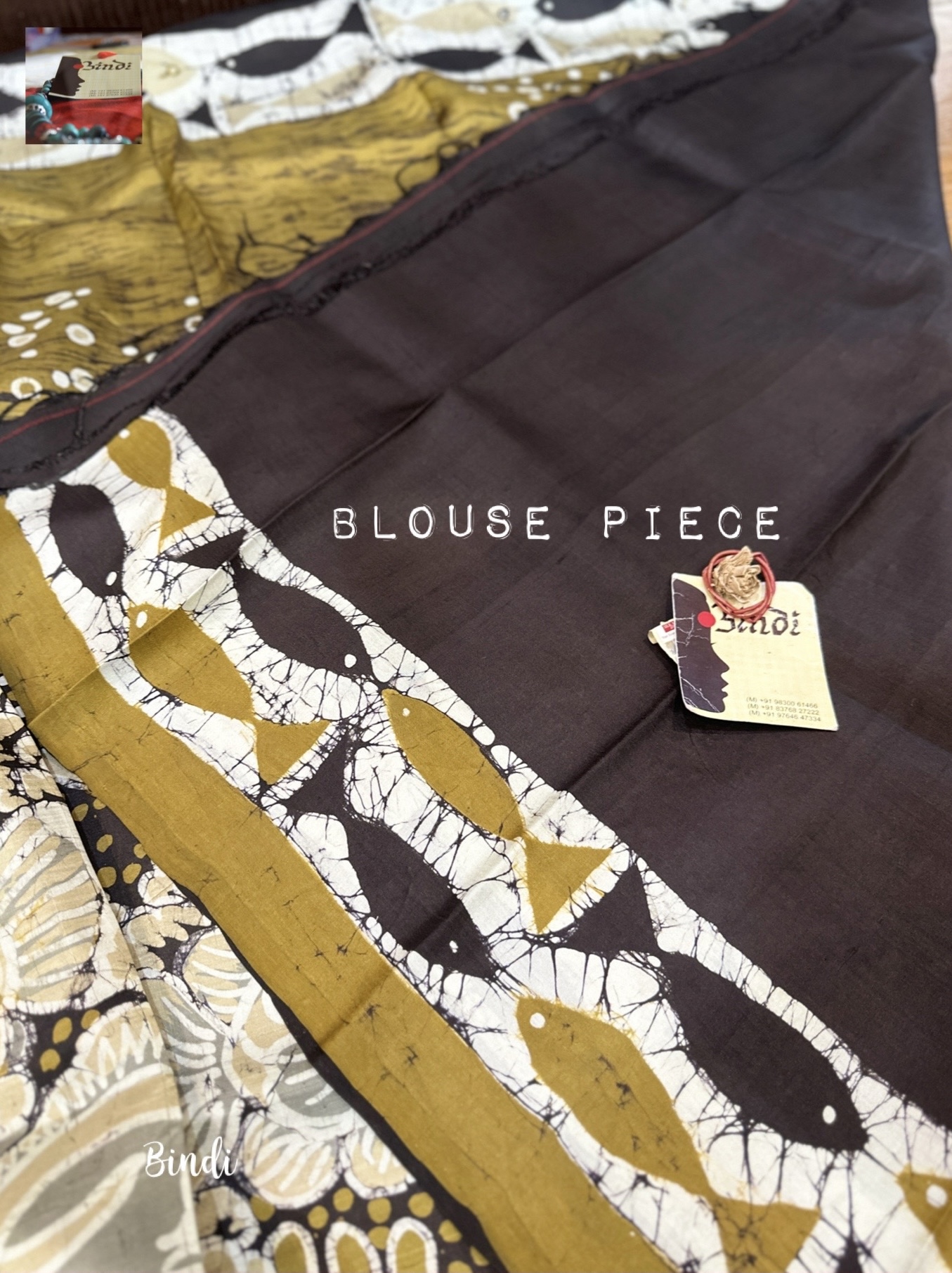 Premium Katan silk saree with exquisite wax-resist batik painting. Featuring intricate fish and aquatic motifs in earthy tones of olive, mustard, ivory, framed with bold fish motif borders. A luxurious drape blending tradition with artistry.