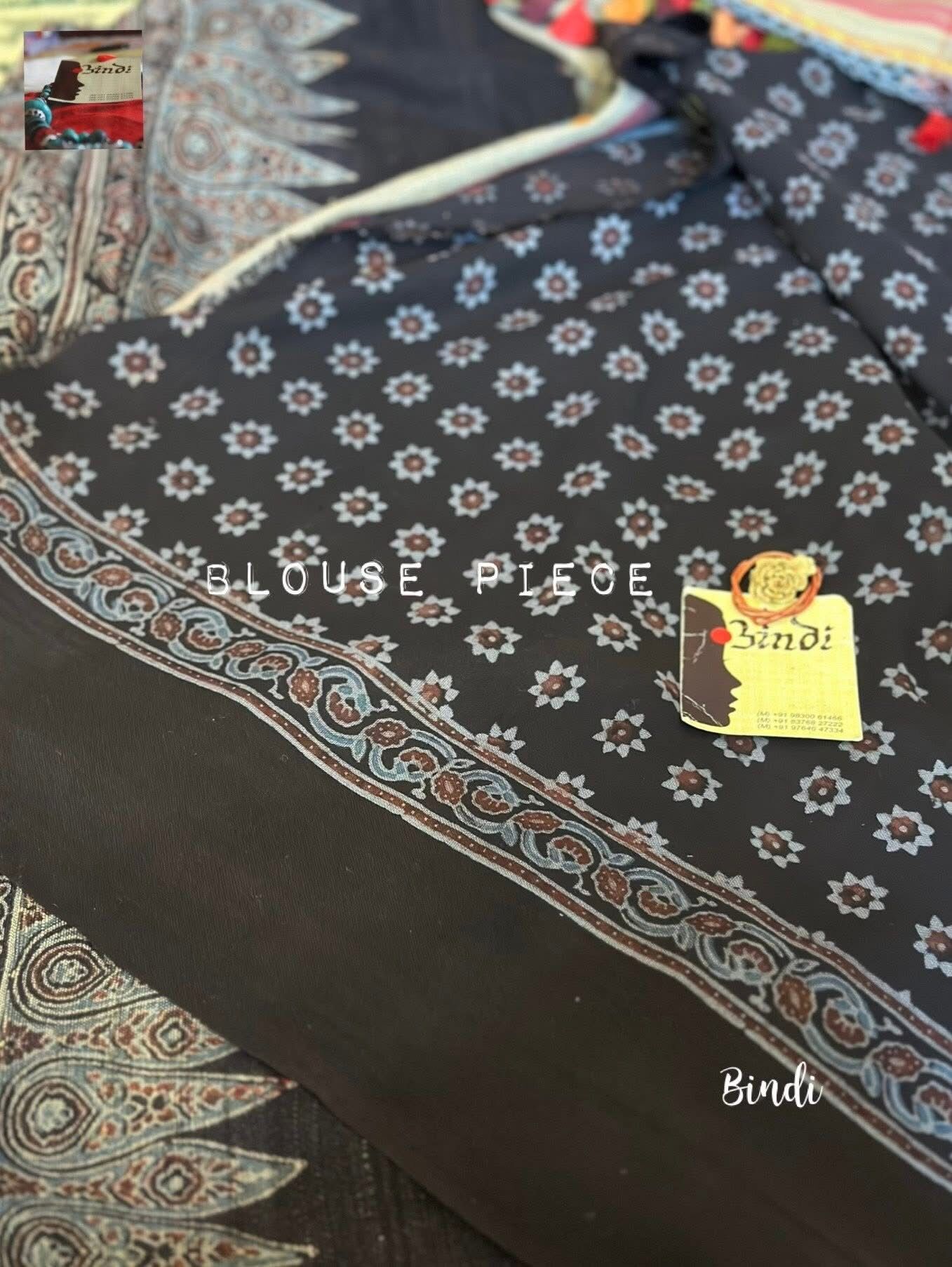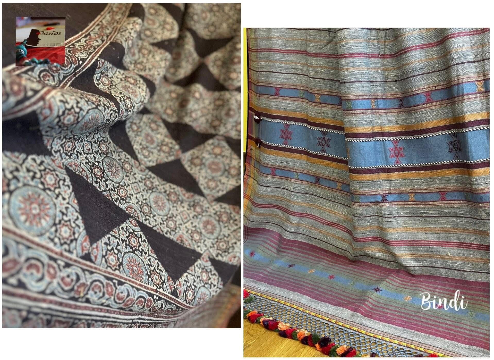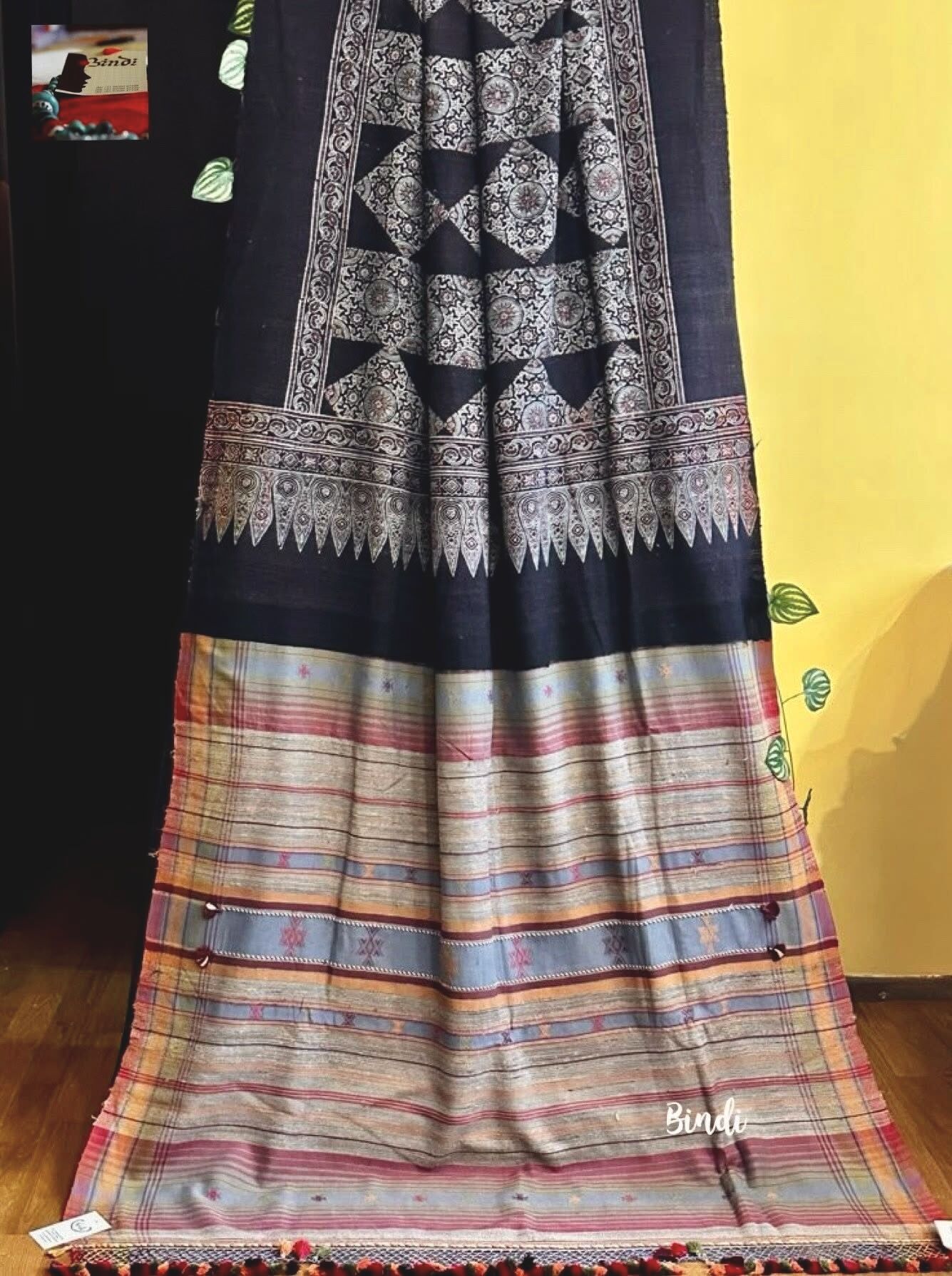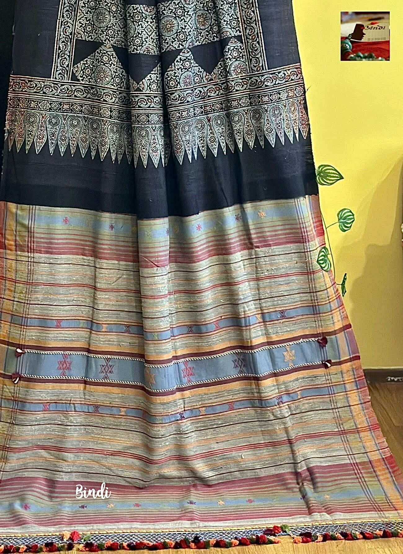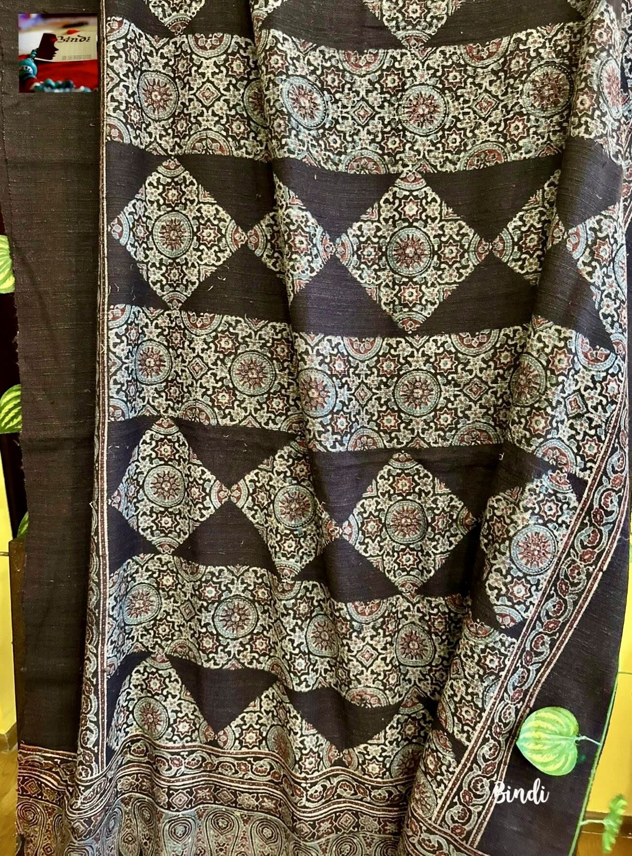 Handcrafted natural dyed Ajrakh hand block printed Tussar Bhujodi Saree from Gujarat