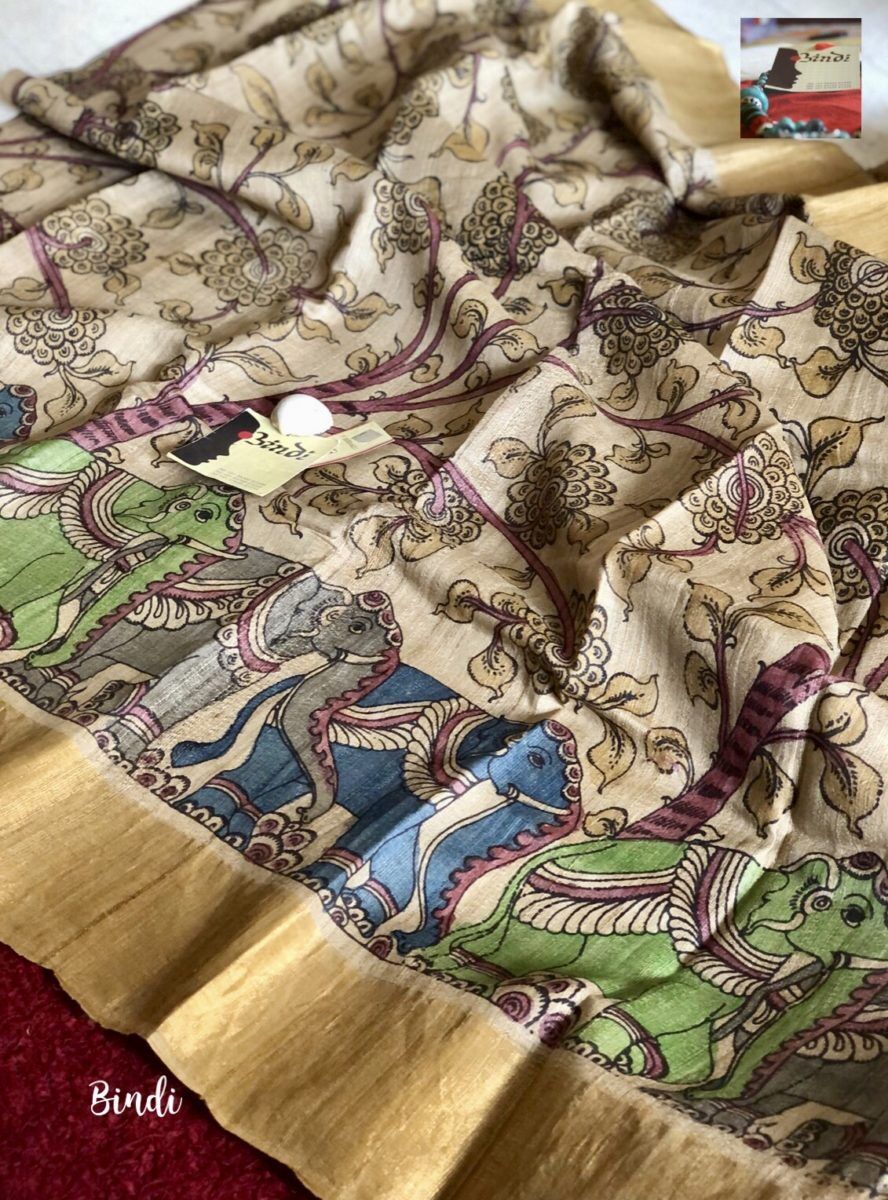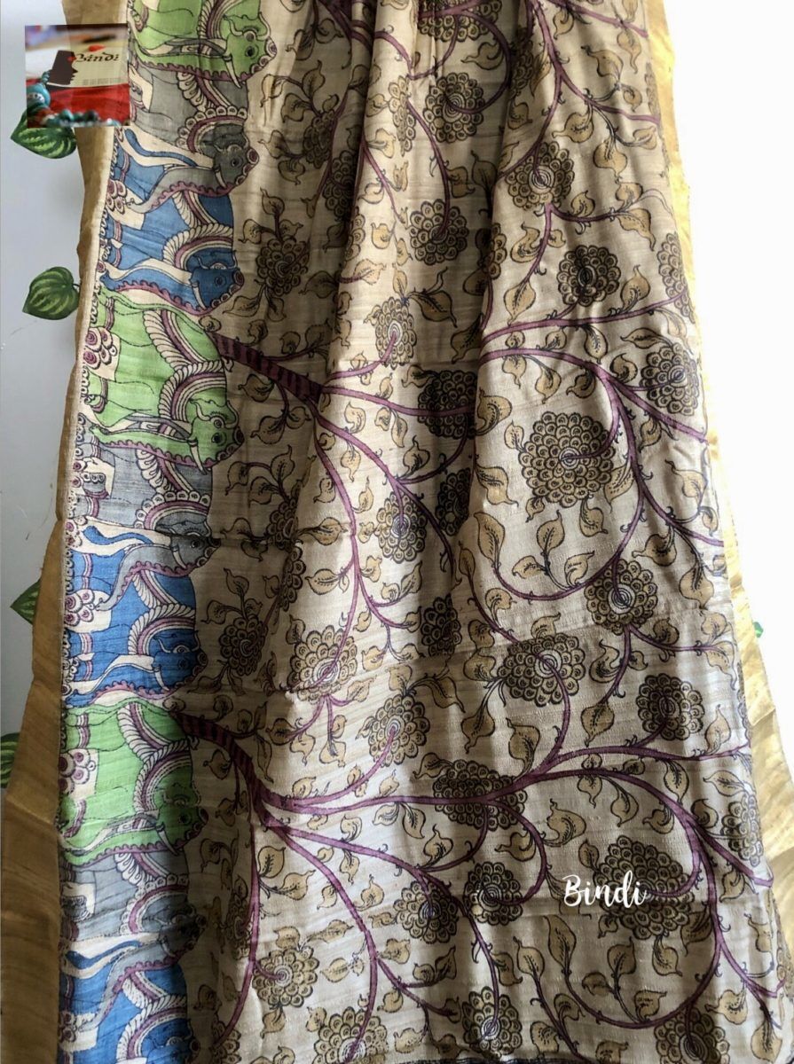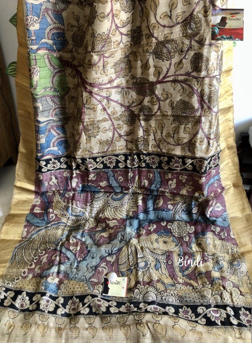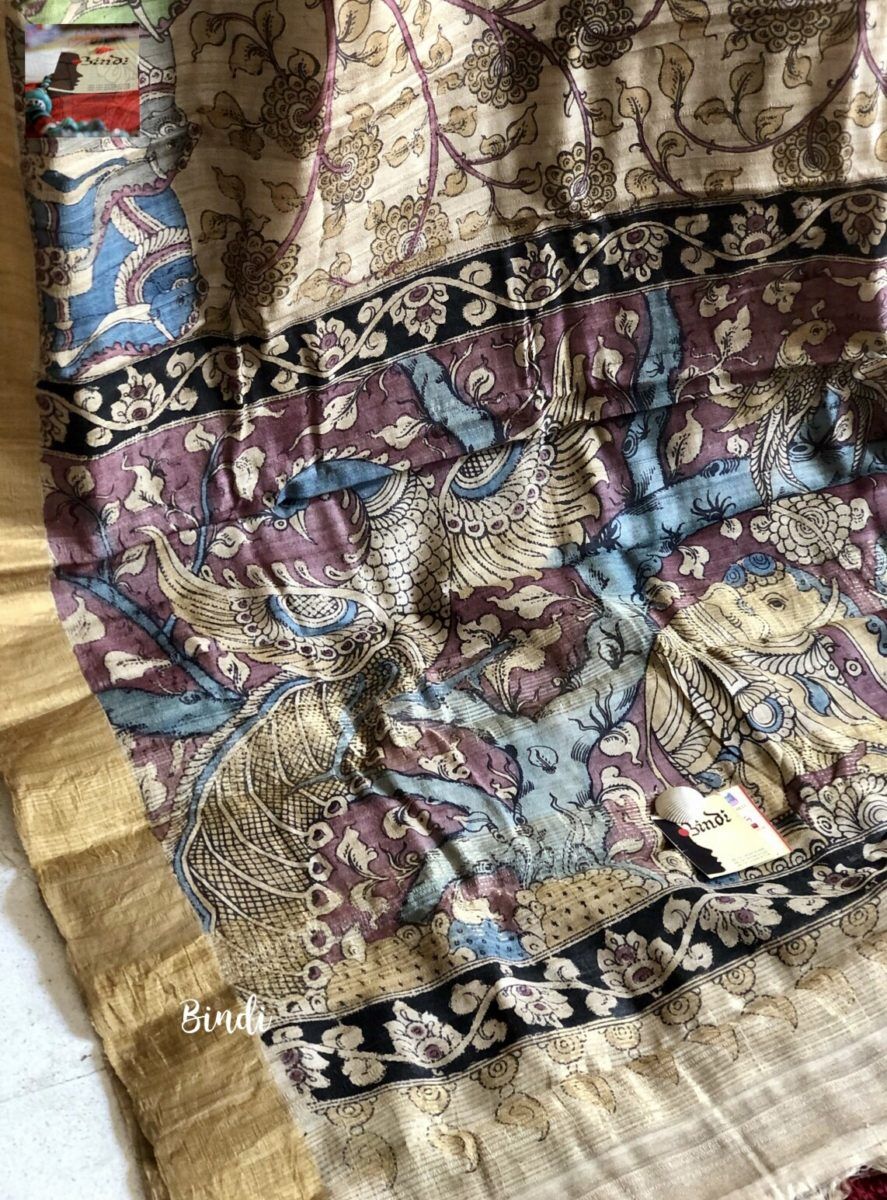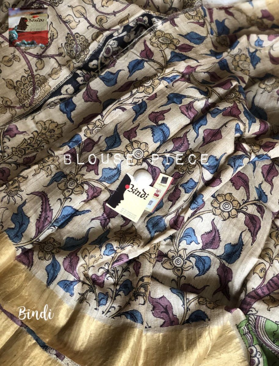 Kalamkari Hand painting on premium quality tussar silk with hand painted blouse piece