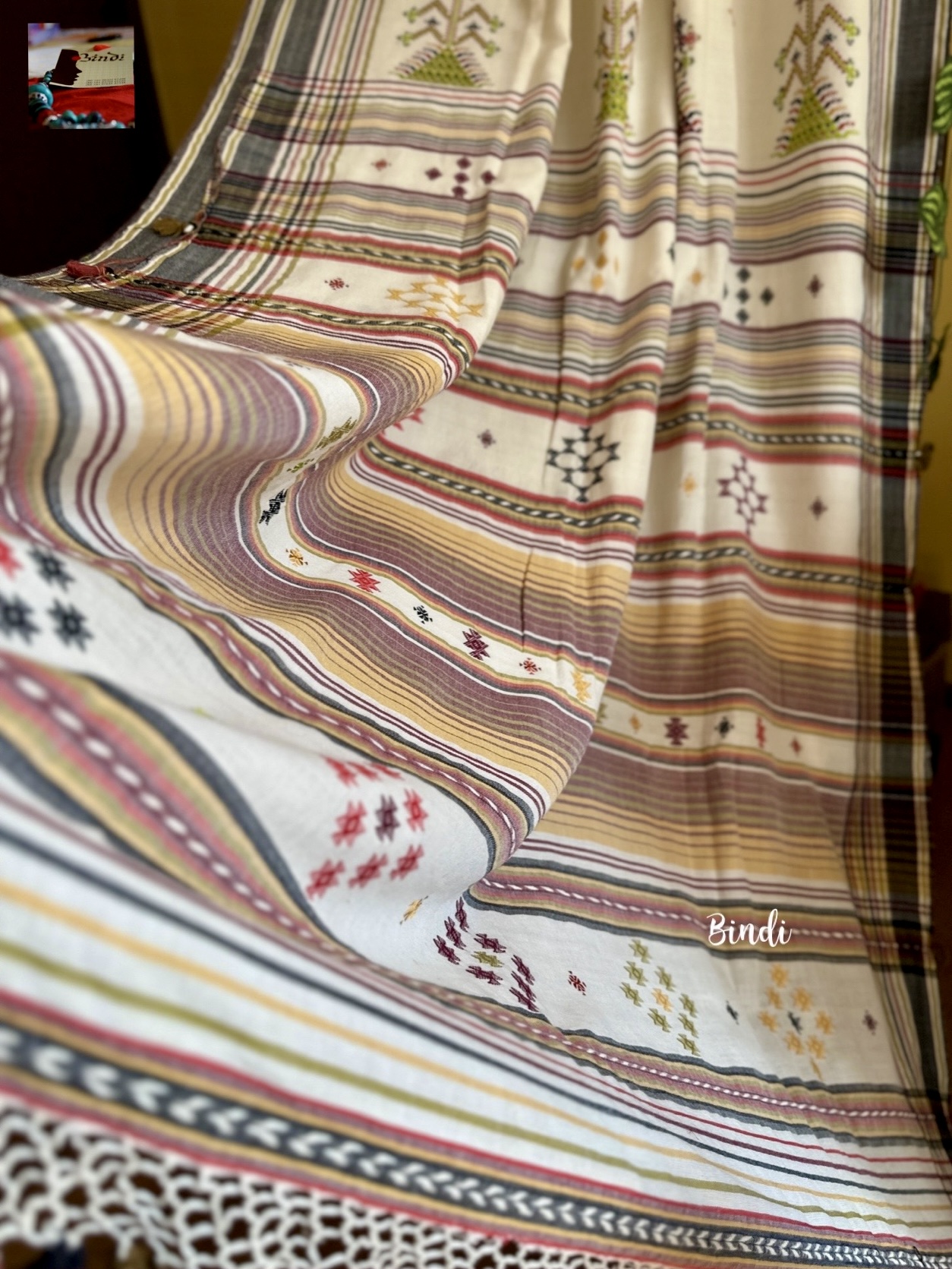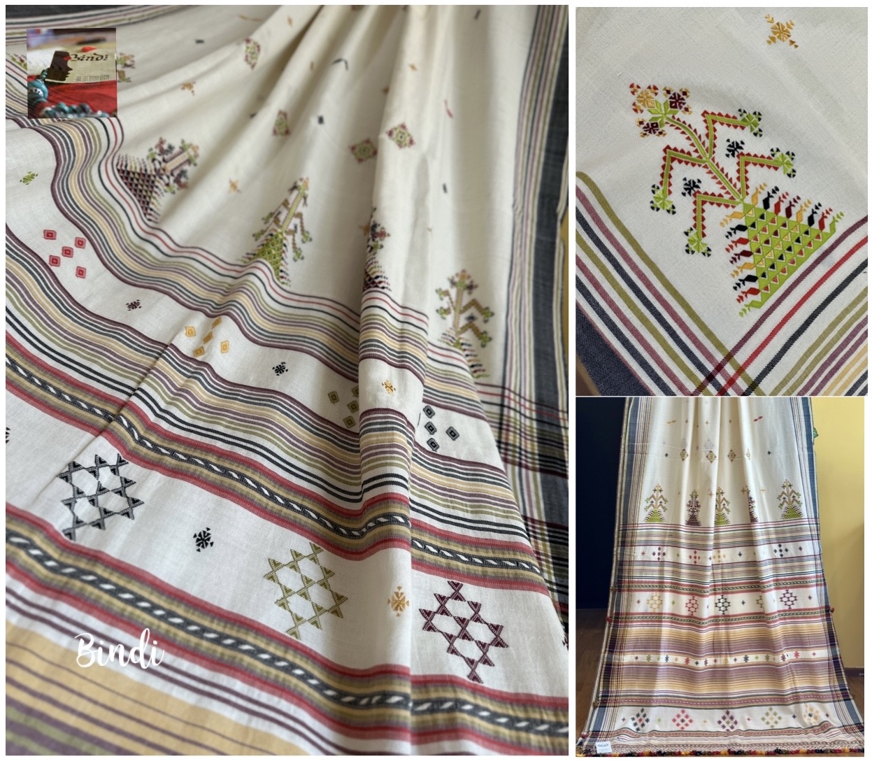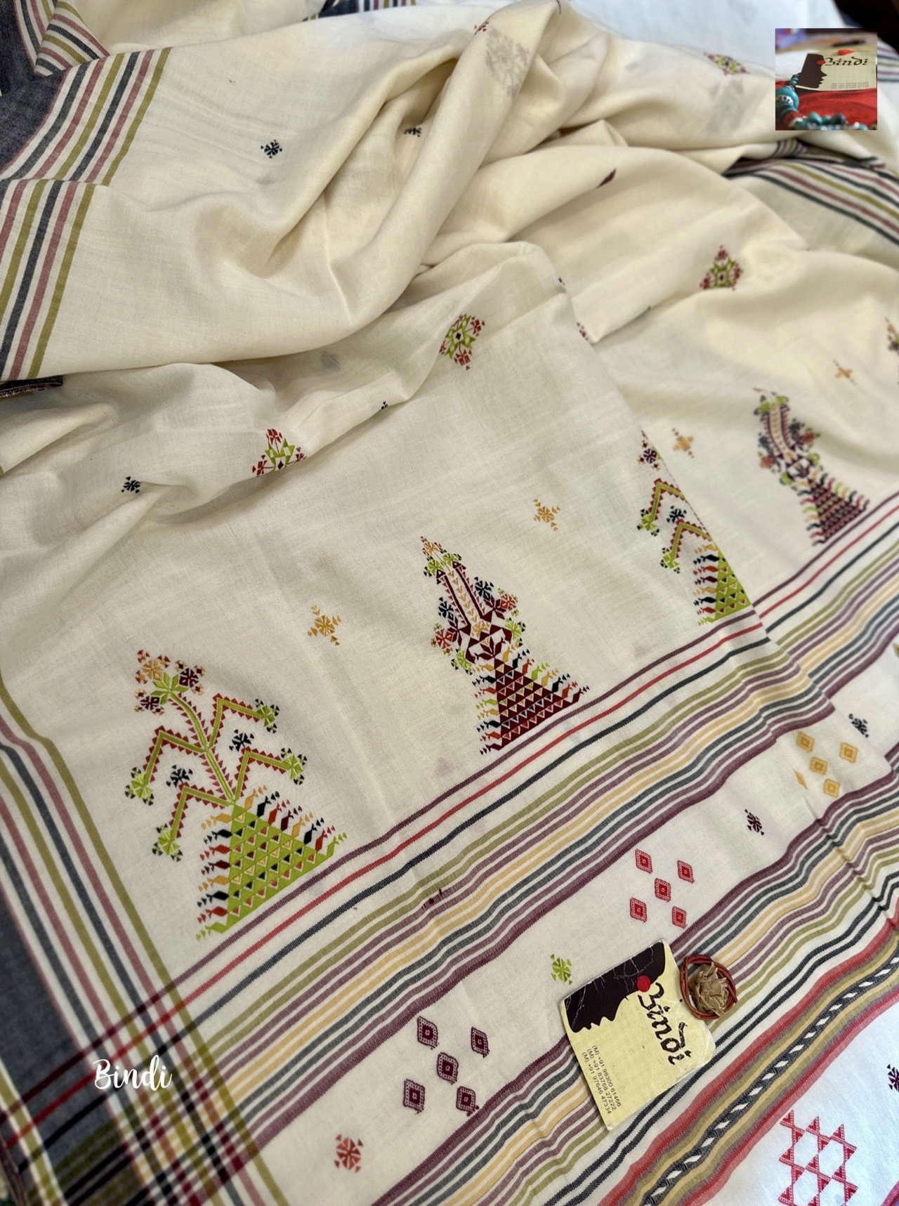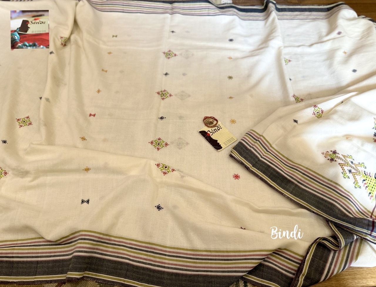 - Soof embroidery meets Bhujodi Kala cotton in this beautifully handcrafted saree. The delicate geometric motifs, paired with a soft, earthy drape, make it a timeless and elegant choice. Studio Bindi’s exclusive celebration of tradition and craftsmanship.