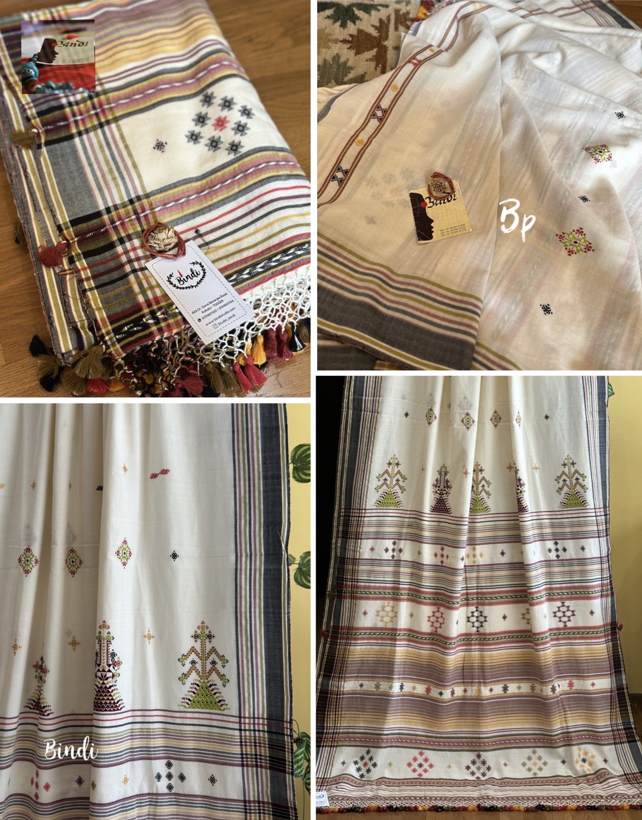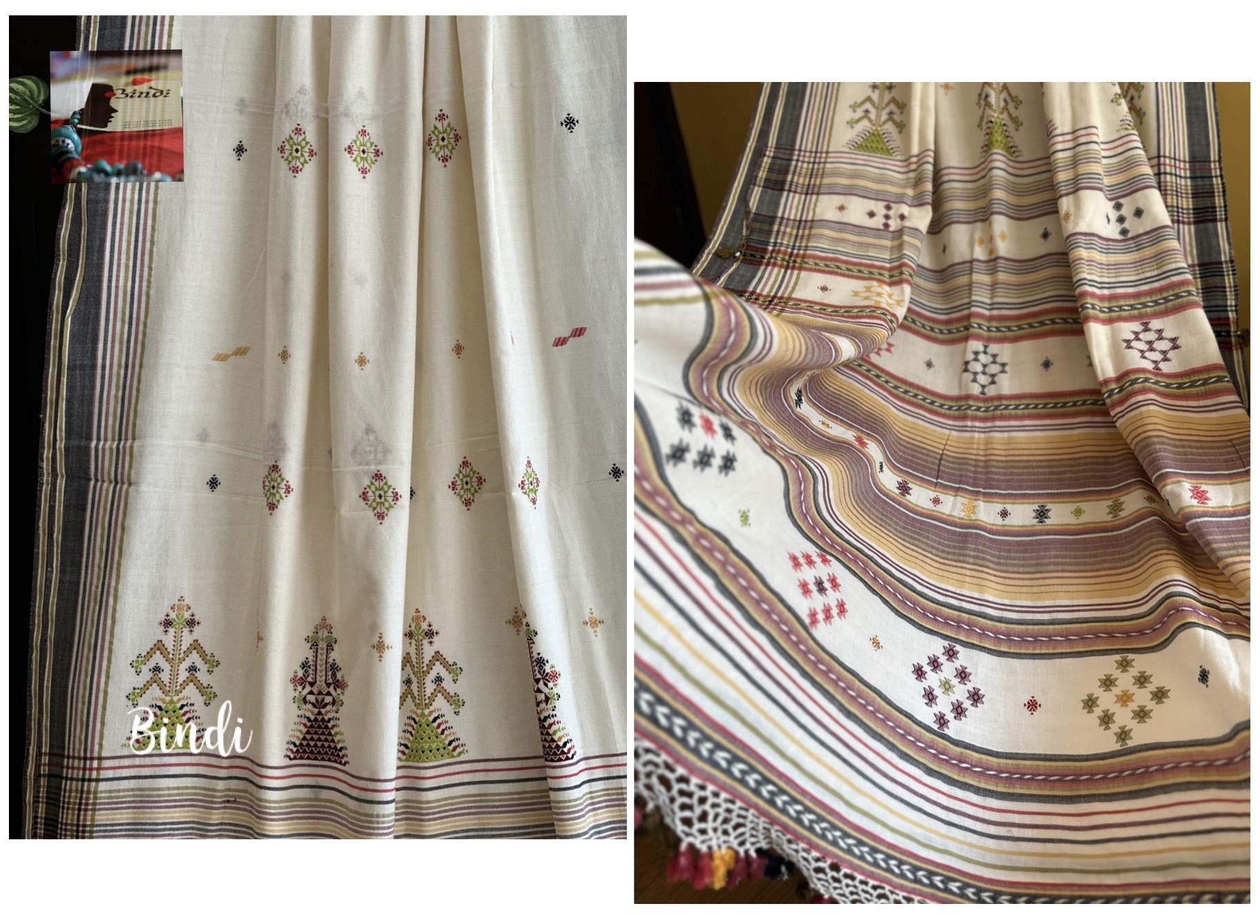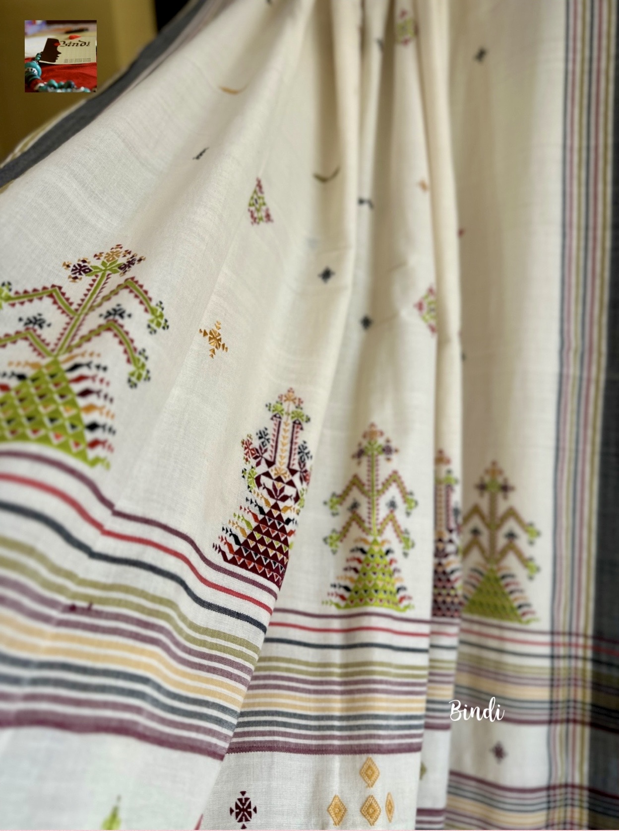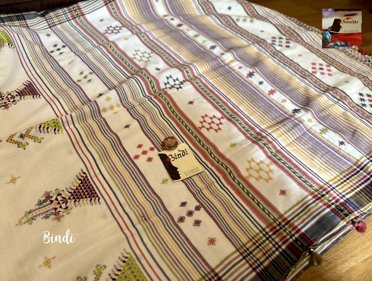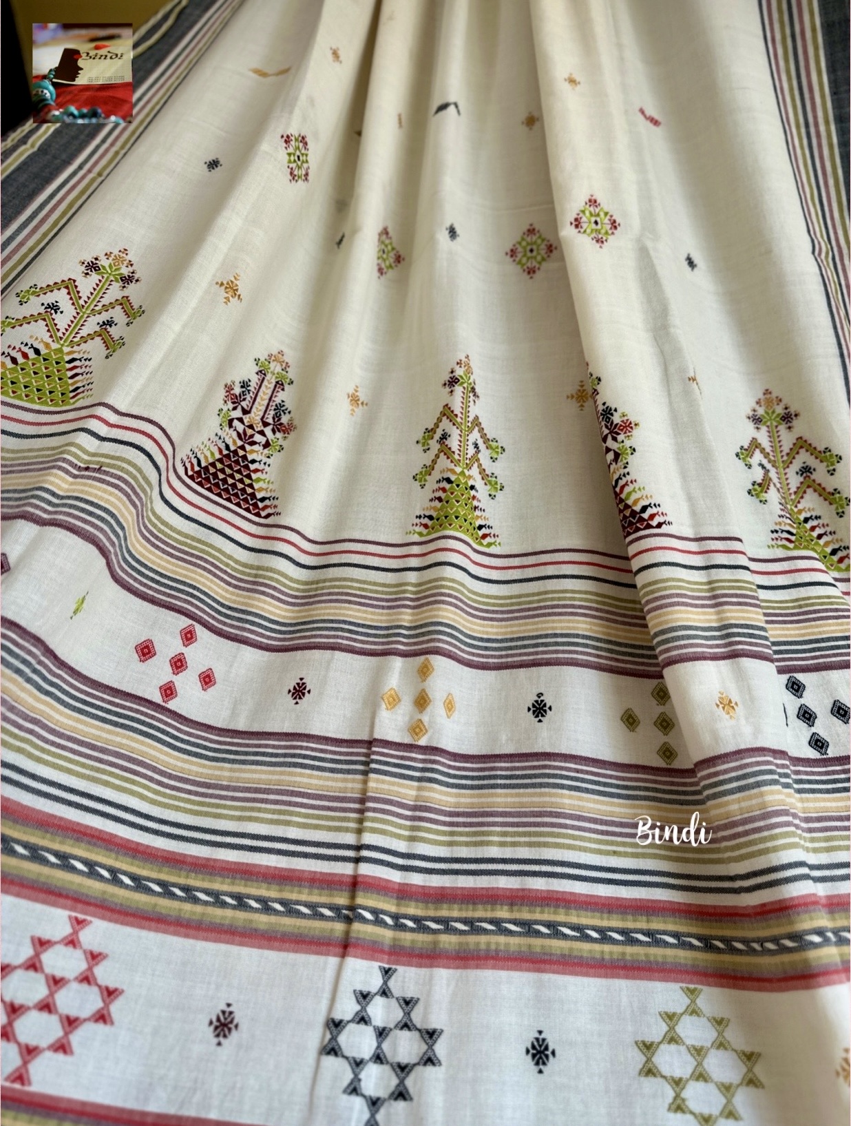 - Soof embroidery meets Bhujodi Kala cotton in this beautifully handcrafted saree. The delicate geometric motifs, paired with a soft, earthy drape, make it a timeless and elegant choice. Studio Bindi’s exclusive celebration of tradition and craftsmanship.