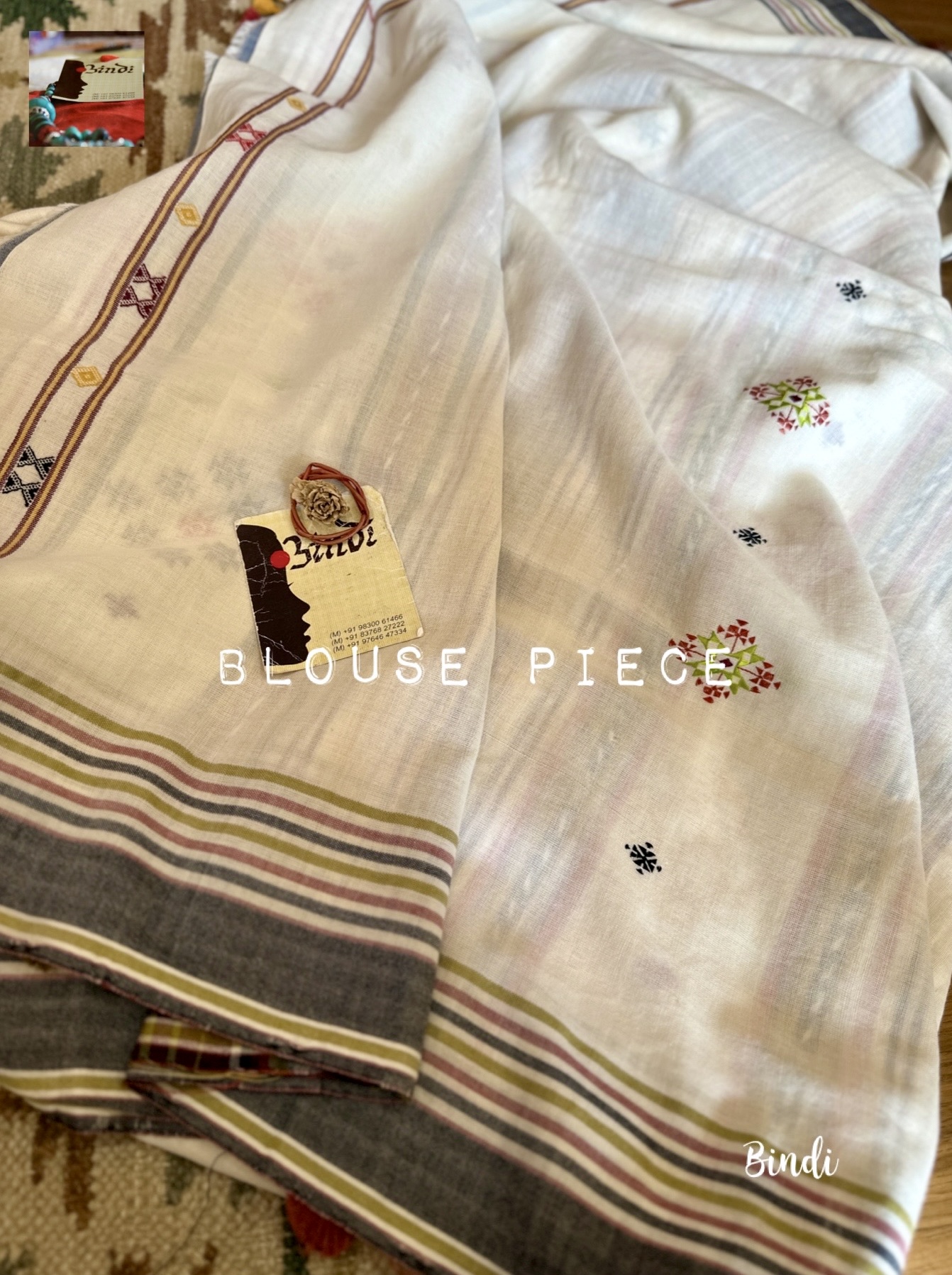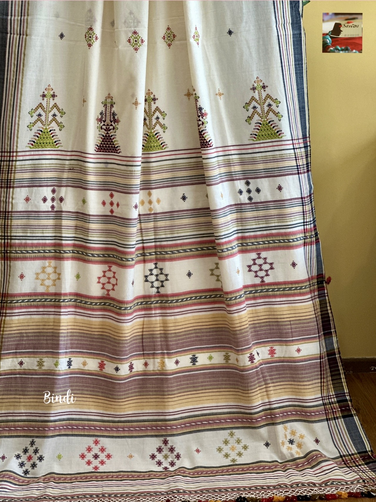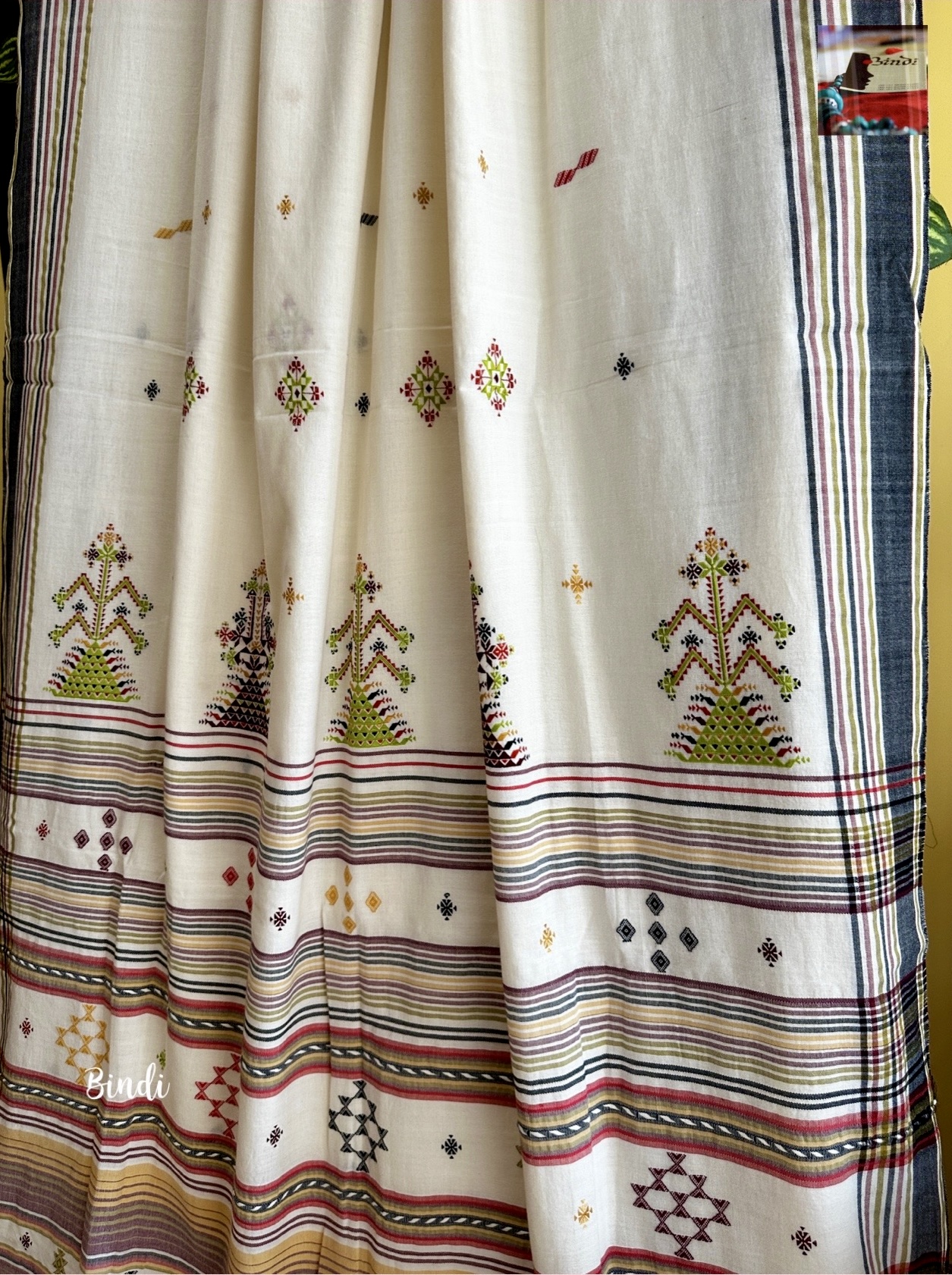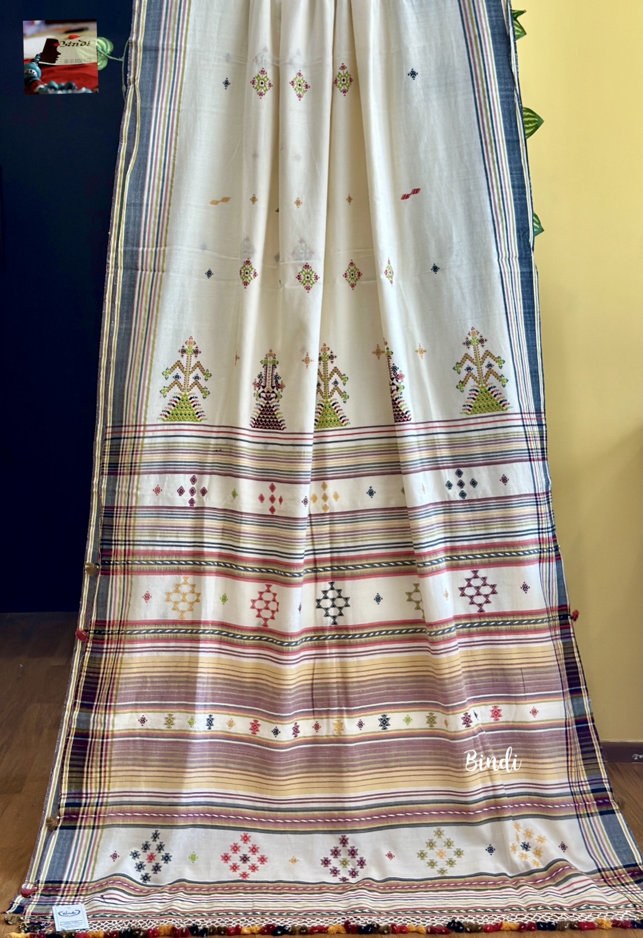 - Soof embroidery meets Bhujodi Kala cotton in this beautifully handcrafted saree. The delicate geometric motifs, paired with a soft, earthy drape, make it a timeless and elegant choice. Studio Bindi’s exclusive celebration of tradition and craftsmanship.