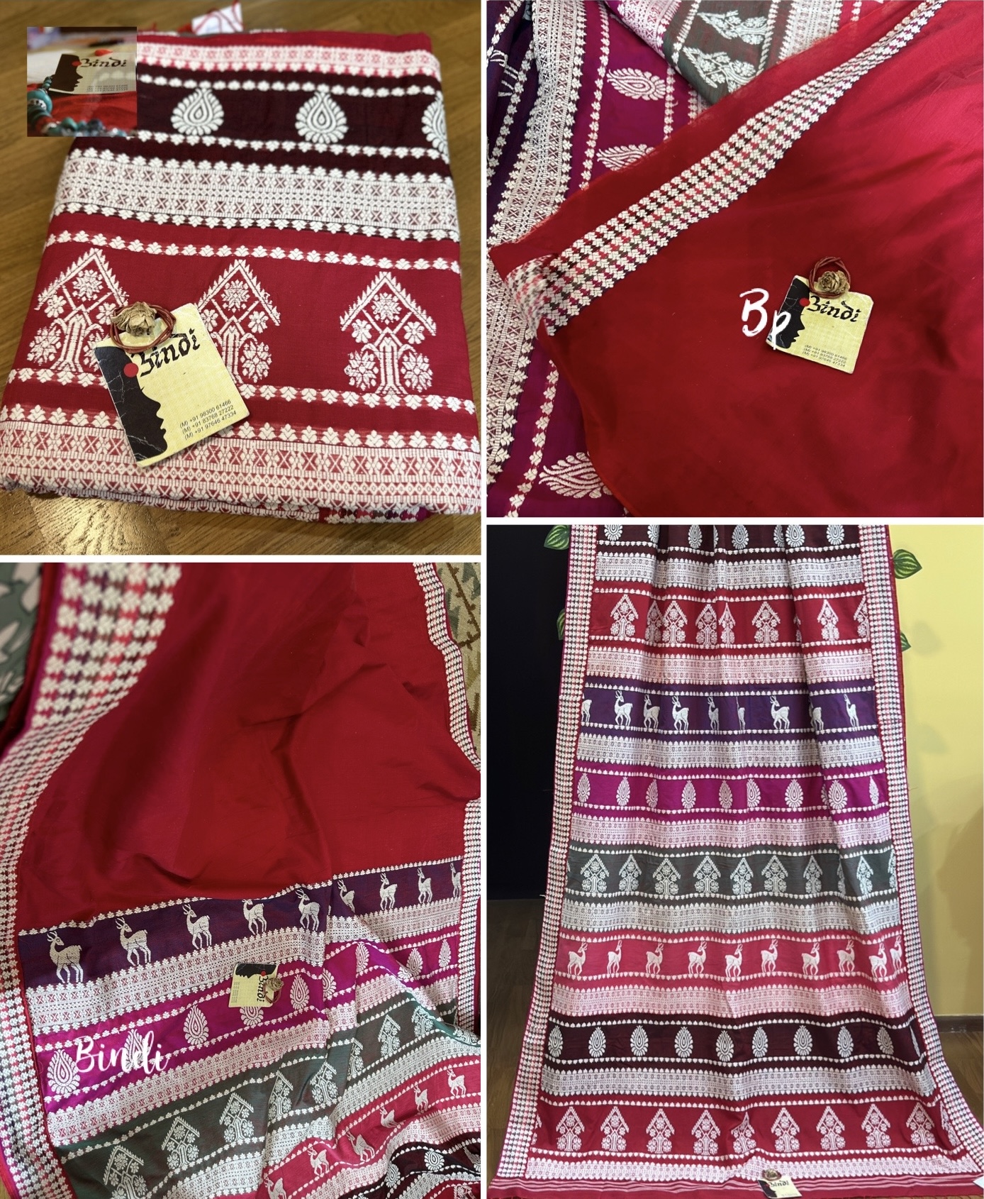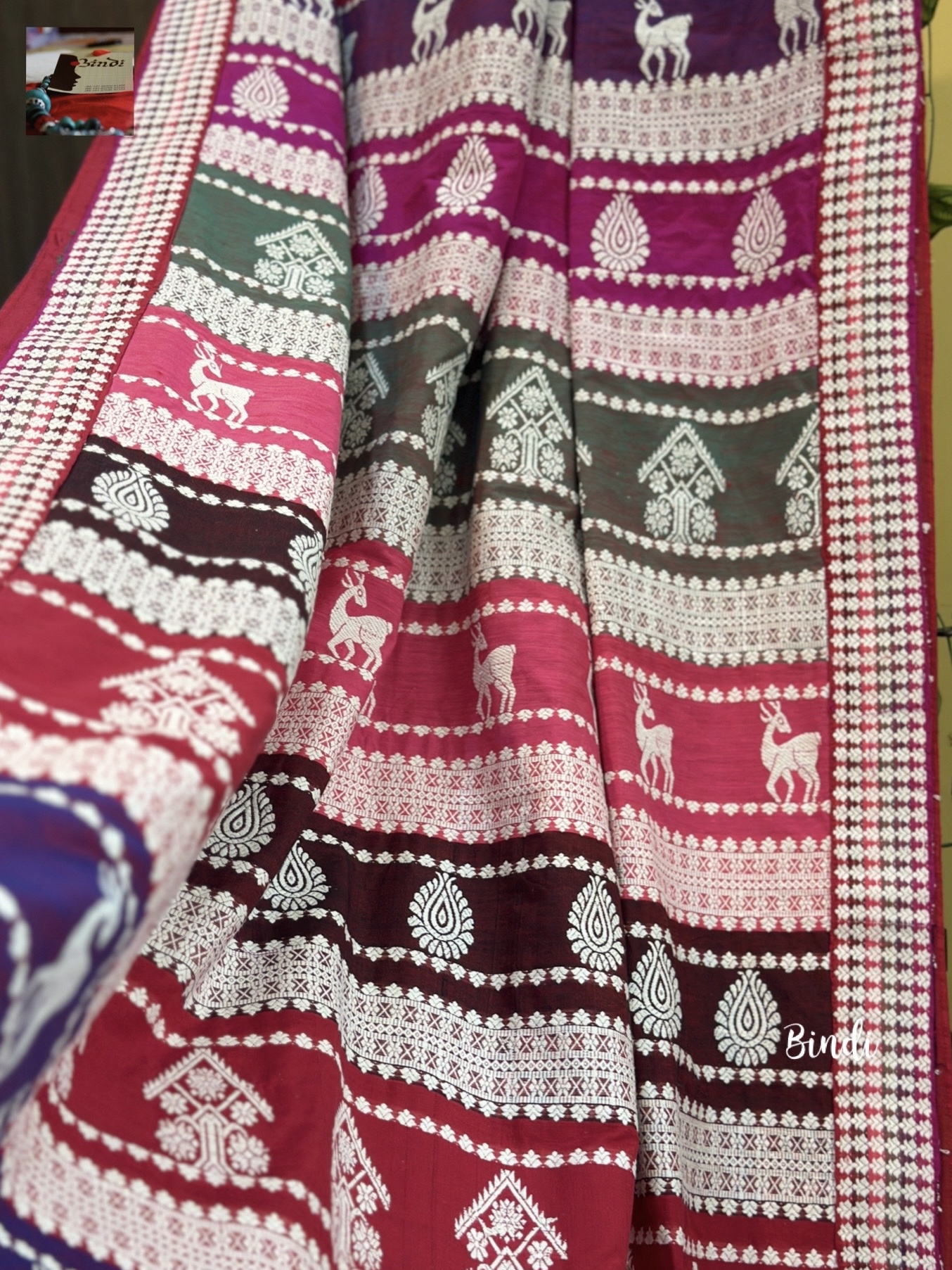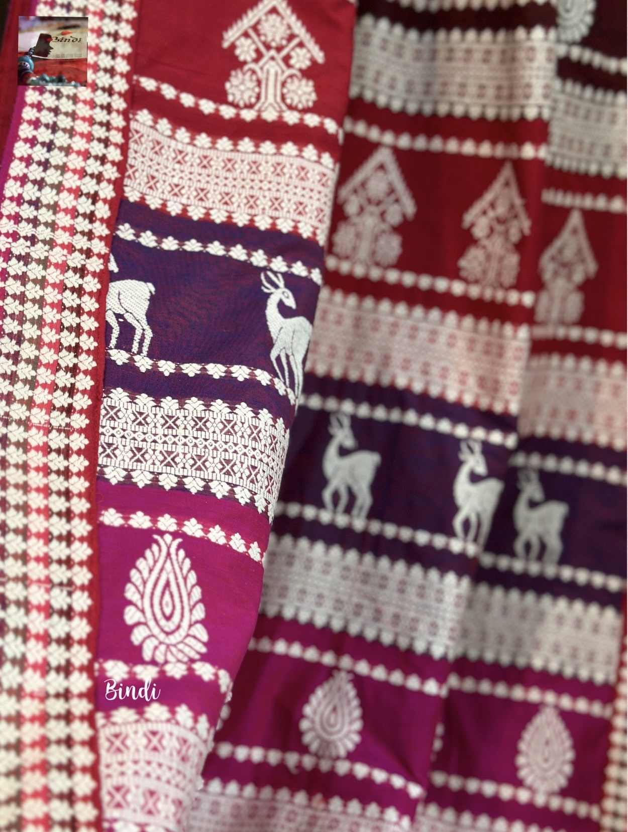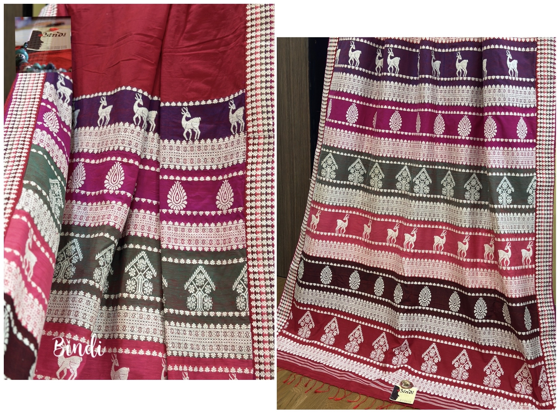 This lightweight, breathable weave blends the rich heritage of Assam handloom with the artistic inspiration of Orissa’s renowned Berhampur Double palla silk. The motifs highlight traditional Assamese Cultural heritage and lifestyle.