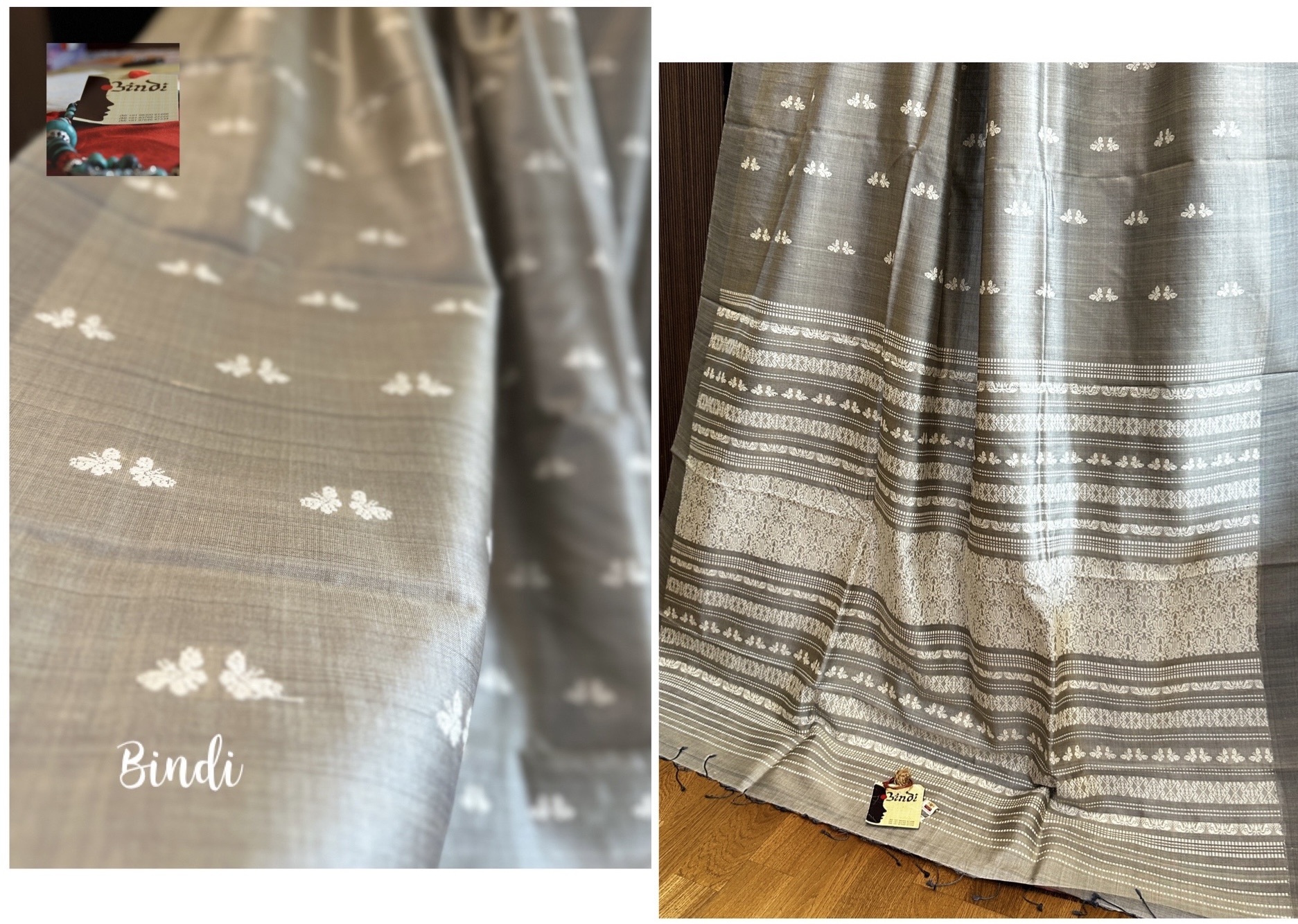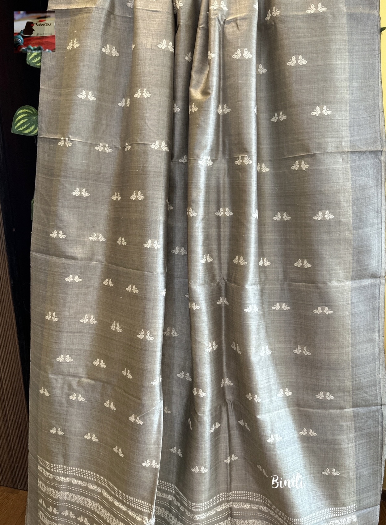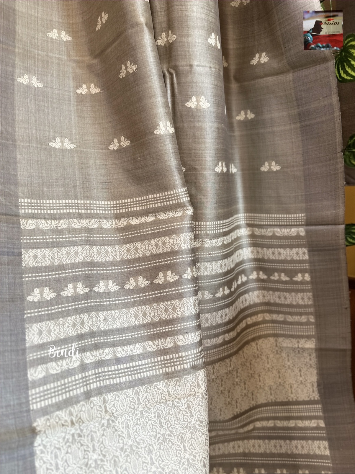 Handwoven handspun fine tussar from Gopalpur, Odisha. The pallu features intricate jalla work, the body is adorned with delicate butterfly motifs in extra-weft technique. Saree length 6.4 meters including blouse piece
