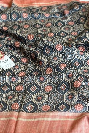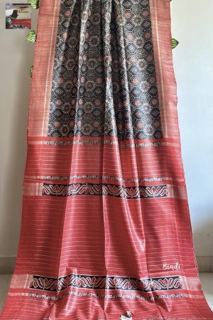 Natural dye vegetable coloured hand block printed Ajrakh Modal silk saree zari palla with blouse piece